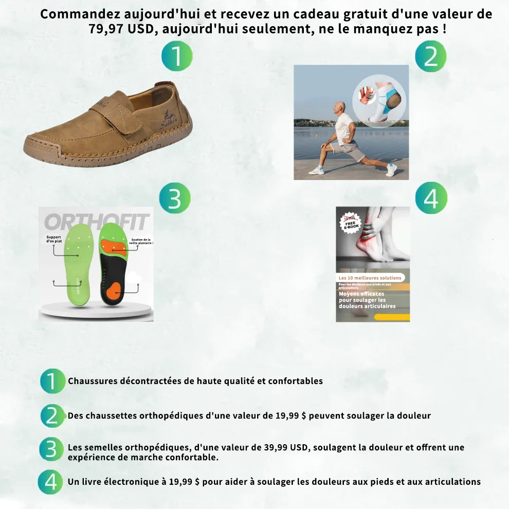 ✅ Les clients qui commandent aujourd'hui recevront gratuitement une paire de chaussettes orthopédiques de haute qualité, des semelles orthopédiques et un livre numérique sur la lutte contre les douleurs à la cheville (valeur totale : 79,97 $ US). Ne ratez pas cette occasion !